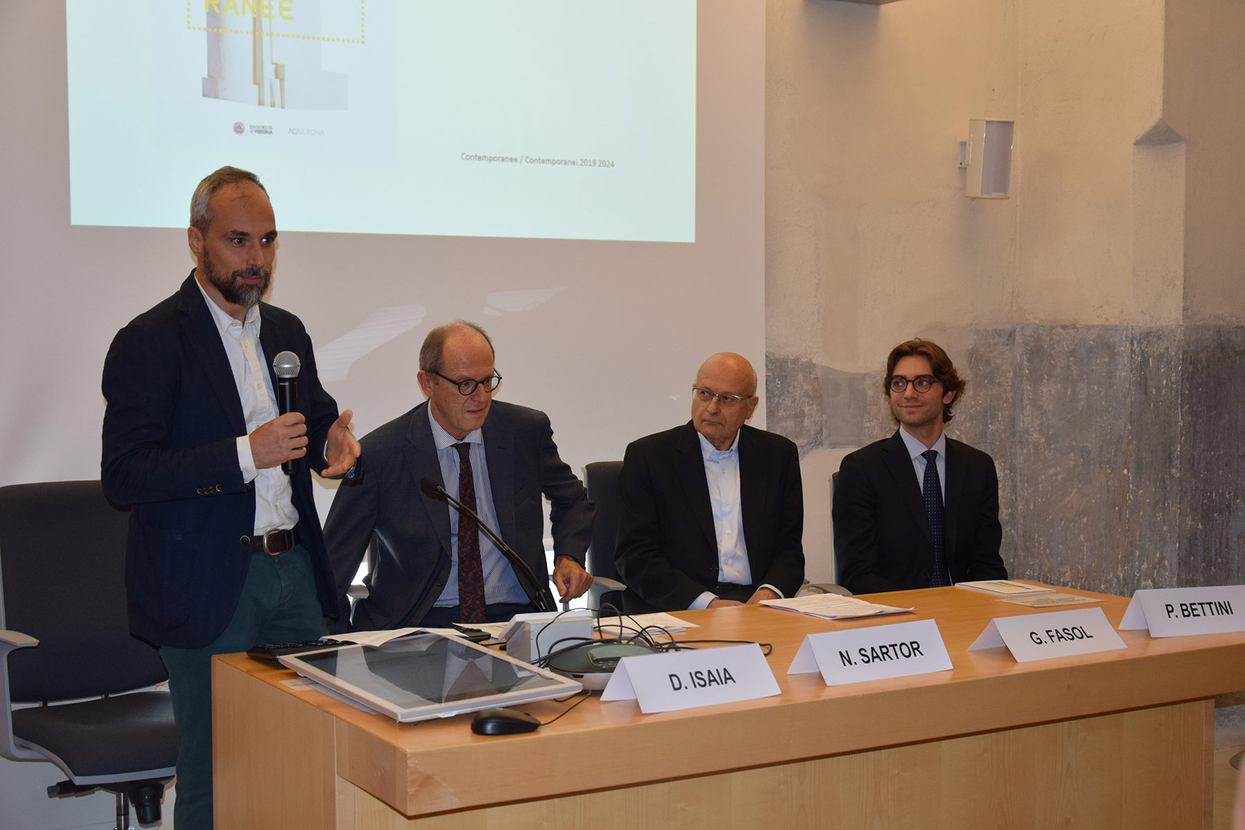 “Contemporanee / contemporanei” è stato presentato nella sala Barbieri del palazzo Giuliari lunedì 17 giugno da Nicola Sartor, rettore dell’università, Giorgio Fasol, presidente di Agi Verona, Fabrizio Magani, soprintendente ad Archeologia, belle arti e paesaggio di Verona, Denis Isaia, curatore dell’opera e Francesca Rossi, direttrice dei Musei civici di Verona.