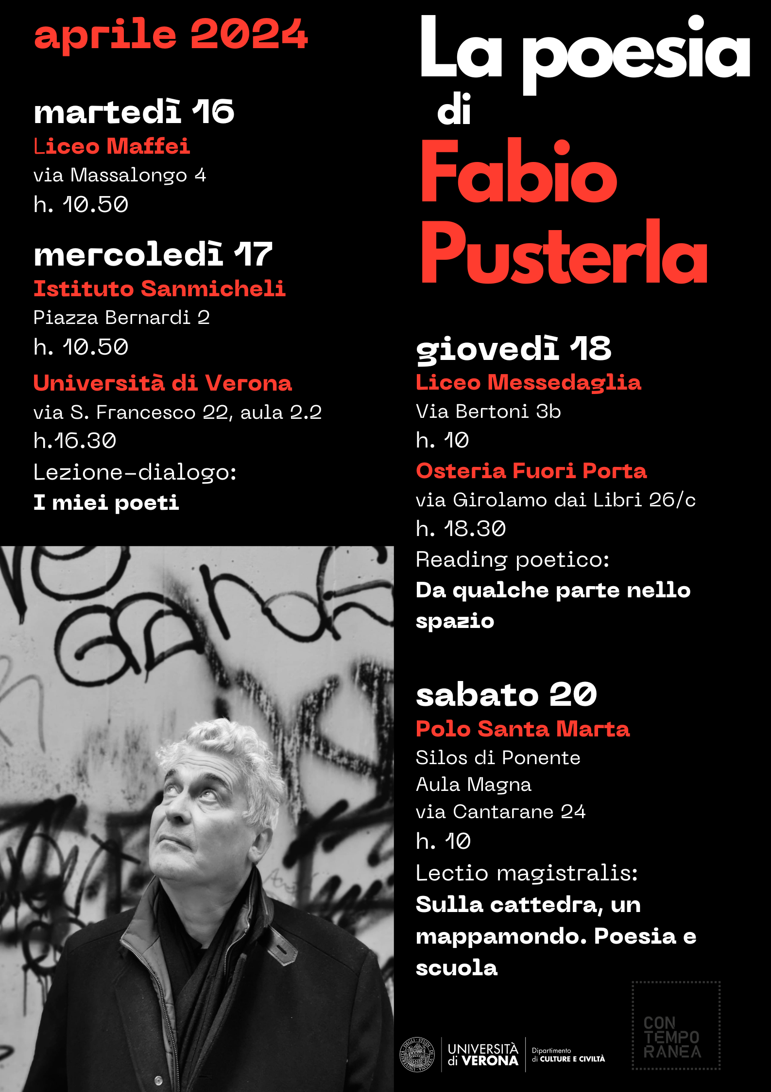 from April 16, 2024 to April 20, 2024L'iniziativa prevede l'incontro di Fabio Pusterla - una delle voci più importanti della poesia contemporanea - con alcune scuole veronesi, con l'università e con la cittadinanza, nell'ambito di un progetto di educazione alla lettura del testo poetico.