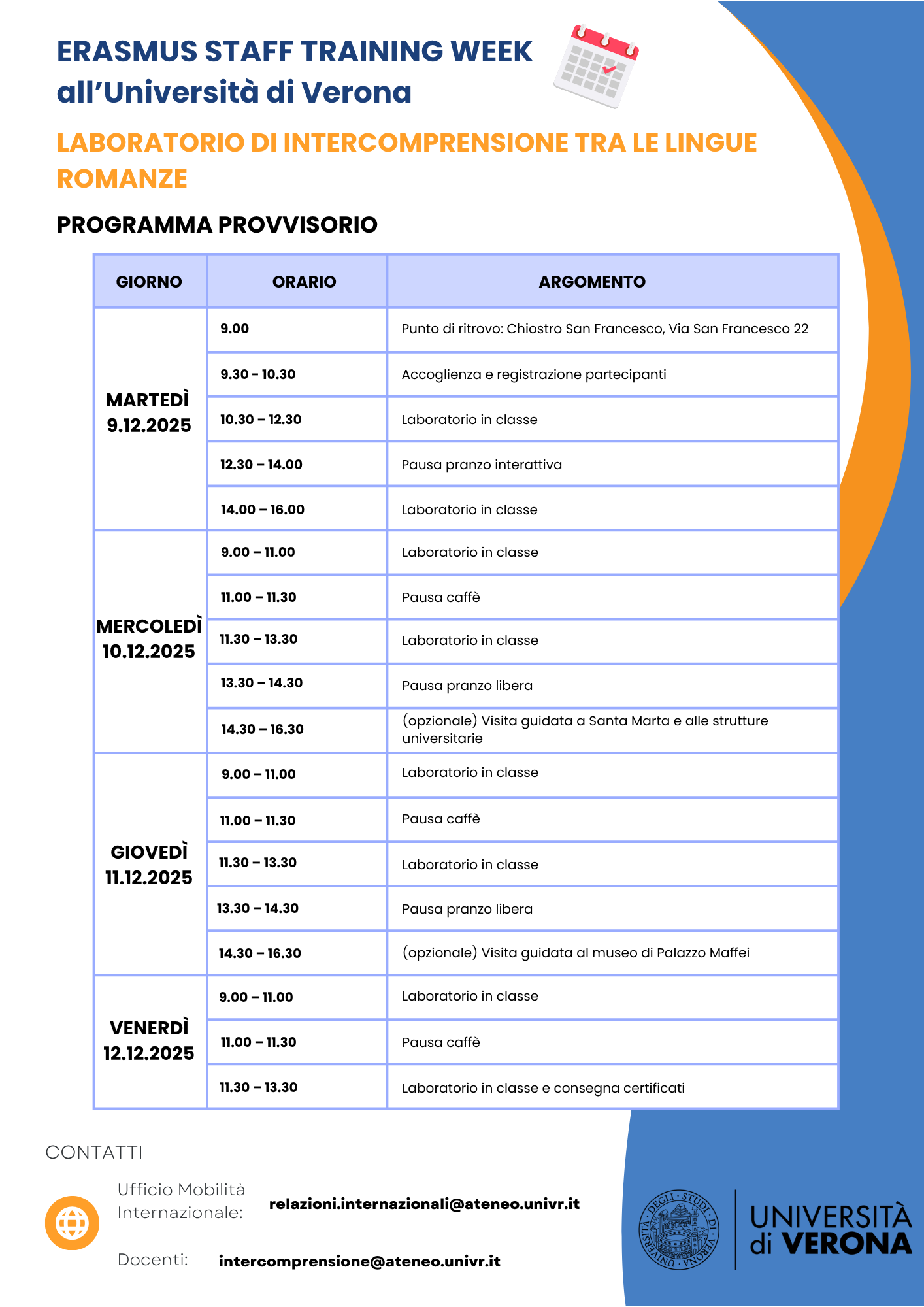 The University of Verona organizes an Erasmus Staff Training Week, 4 days from Tuesday, Dec. 9th and Friday, Dec. 12th 2025, training about the strategies of Intercomprehension between Romance languages.