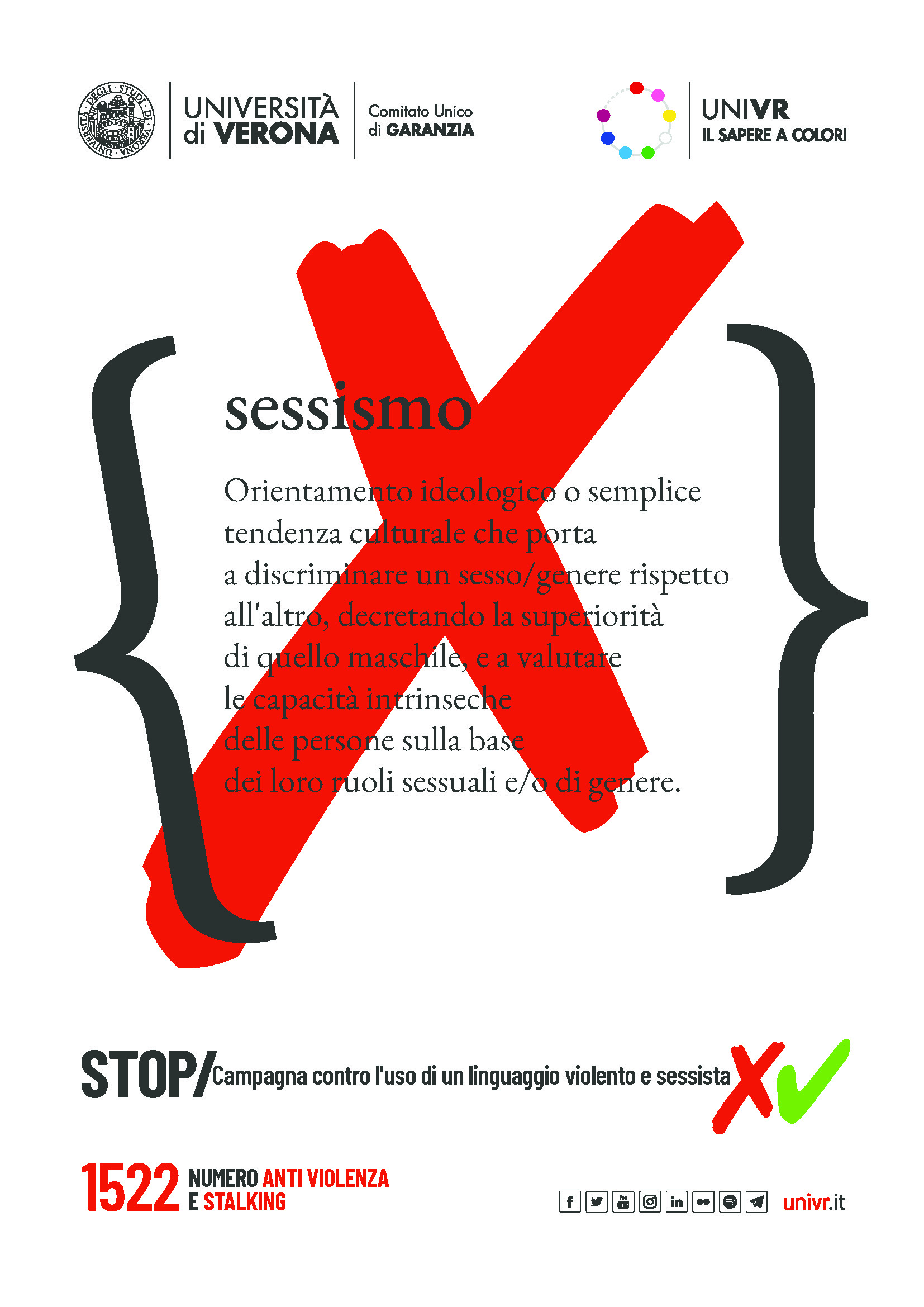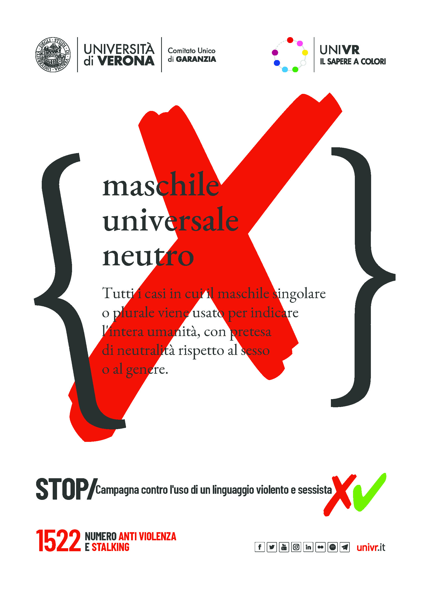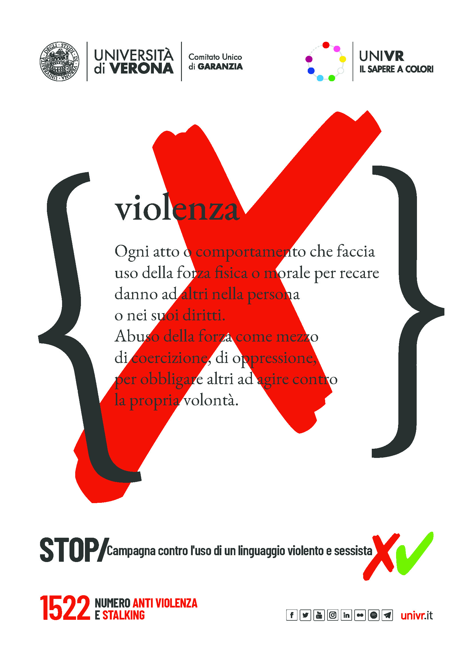 Parte proprio dalle parole la mostra itinerante “STOP/ Campagna contro l’uso di un linguaggio violento e sessista”, promossa dal Cug, il Comitato unico di garanzia dell’ateneo di Verona, in occasione della Giornata internazionale per l’eliminazione della violenza contro le donne, per sensibilizzare sull’uso di un linguaggio corretto e rispettoso. Nei pennelli in mostra sono raccontati, attraverso le parole, gli atteggiamenti da condannare, come il bullismo, la molestia sessuale, la violenza di genere, e quelli da promuovere, come il linguaggio di genere (v. Linee guida), la body positivity, la parità retributiva.