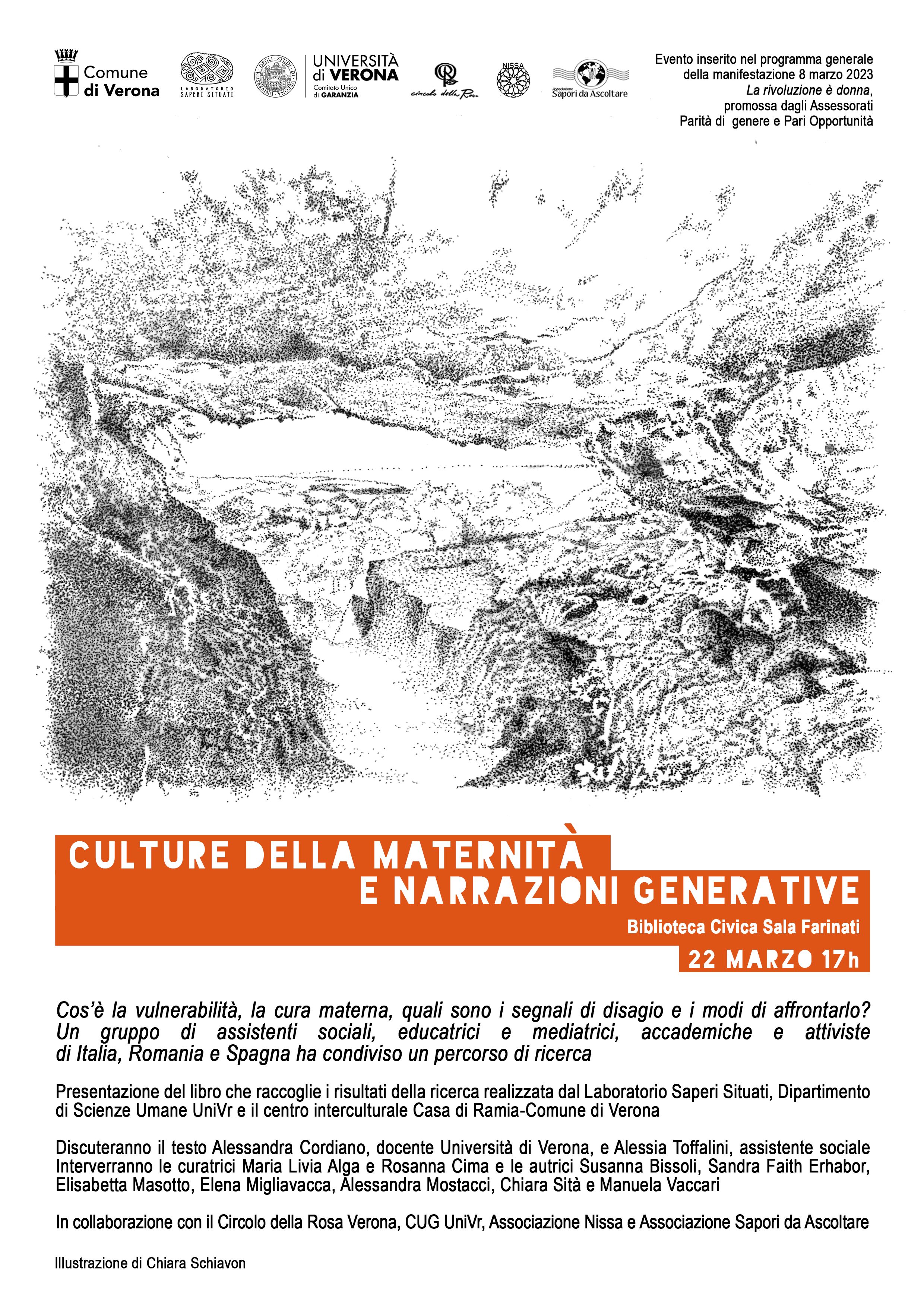 Mercoledì 22 marzo ore 17, in sala Farinati della biblioteca Civica di Verona: presentazione della ricerca "Culture della maternità e narrazioni generative". La vulnerabilità, le cure materne, le culture della maternità sono i temi di una ricerca svolta dal laboratorio saperi situati (dipartimento di Scienze Umane) nei servizi socio-sanitari ed educativi e condivisa con operatrici d'Italia, Romania e Spagna. L'evento è organizzato dall'assessorato pari opportunità del Comune di Verona, in collaborazione con Circolo della Rosa, Associazione Nissa, Associazione Sapori d'ascoltare e il Comitato Unico di Garanzia di Ateneo.
