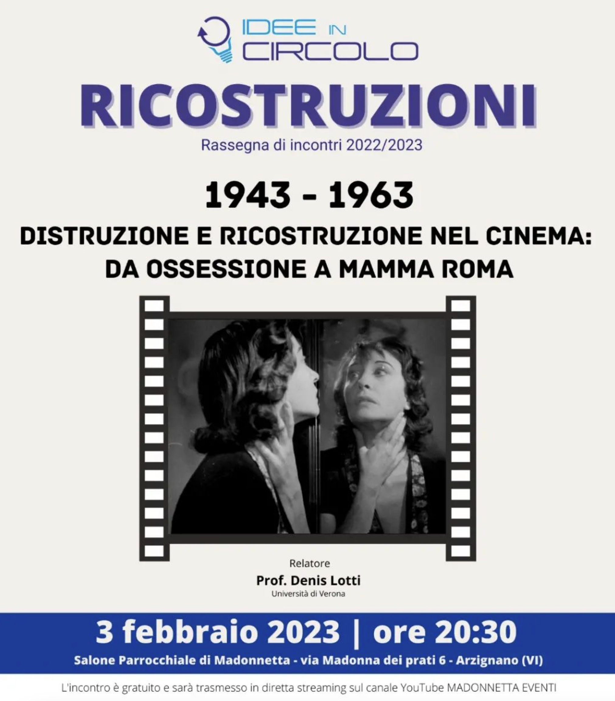 - "1943-1963. Distruzione e ricostruzione nel cinema: da 'Ossessione' a 'Mamma Roma'" (conferenza a cura di Denis Lotti)