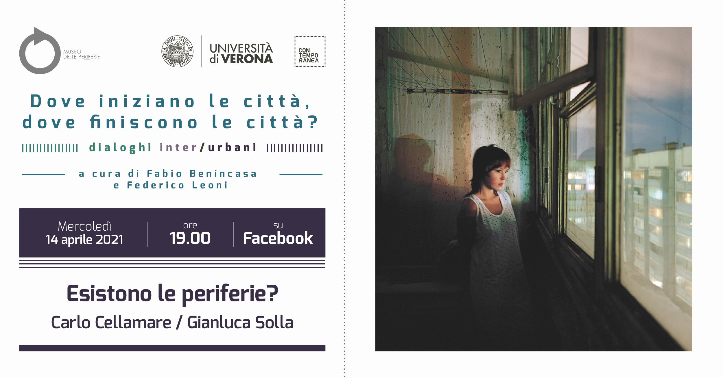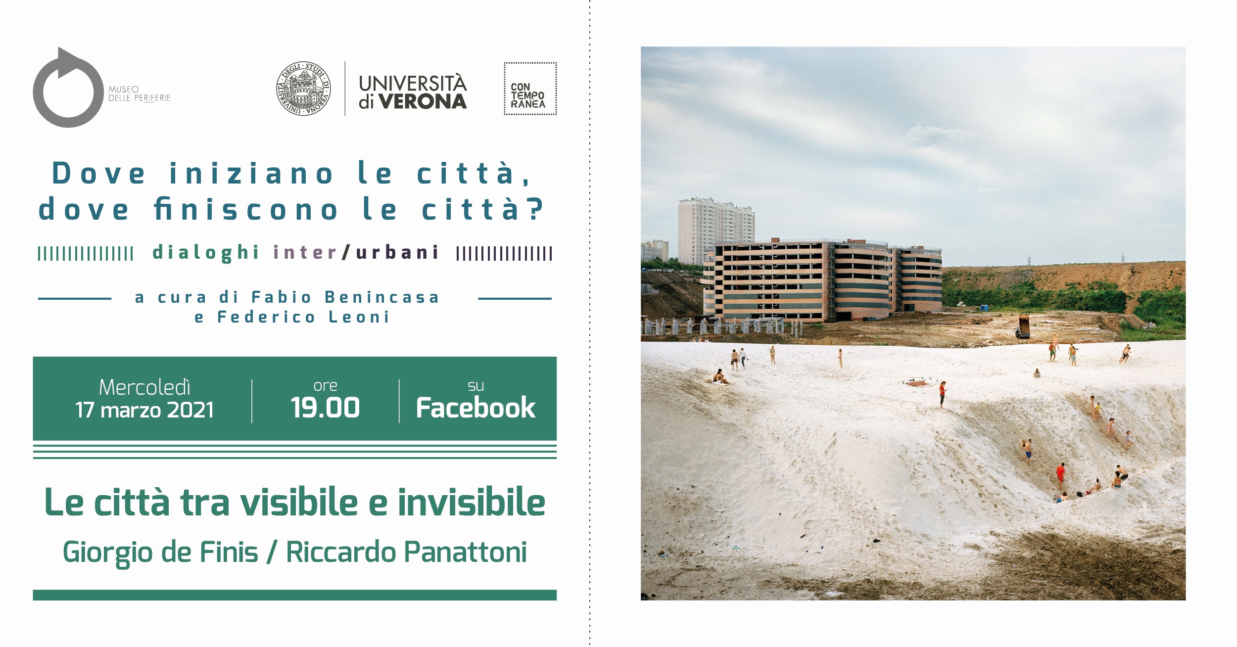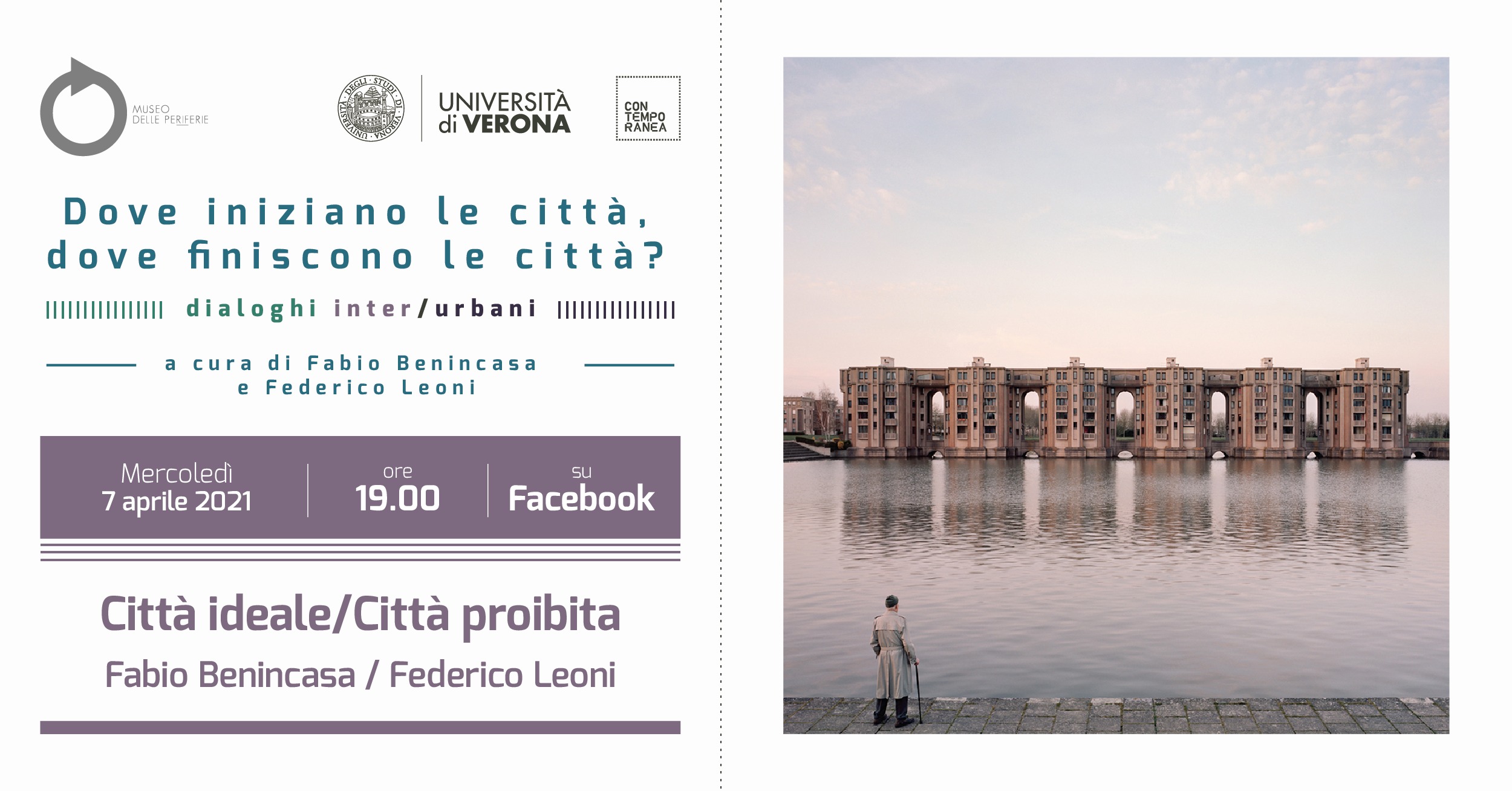 Il tema della città è al centro dei tre dialoghi a cura di Fabio Benincasa, curatore e critico d’arte, e Federico Leoni, docente di Antropologia filosofica in ateneo, in programma il 17 marzo, il 7 aprile e il 14 aprile, promossi dall’università di Verona all'interno del progetto Contemporanea, insieme al Museo delle periferie.