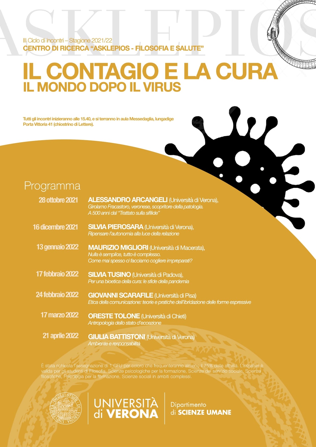 “Il contagio e la cura. Il mondo dopo il virus” è il titolo del ciclo di incontri organizzati quest’anno dal Centro “Asklepios. Filosofia Cura Trasformazione”, attivo presso il Dipartimento di Scienze umane dell’Università di Verona. Un viaggio all’interno degli aspetti, sempre luminosi e tenebrosi insieme, di quella trama chiamata realtà.
